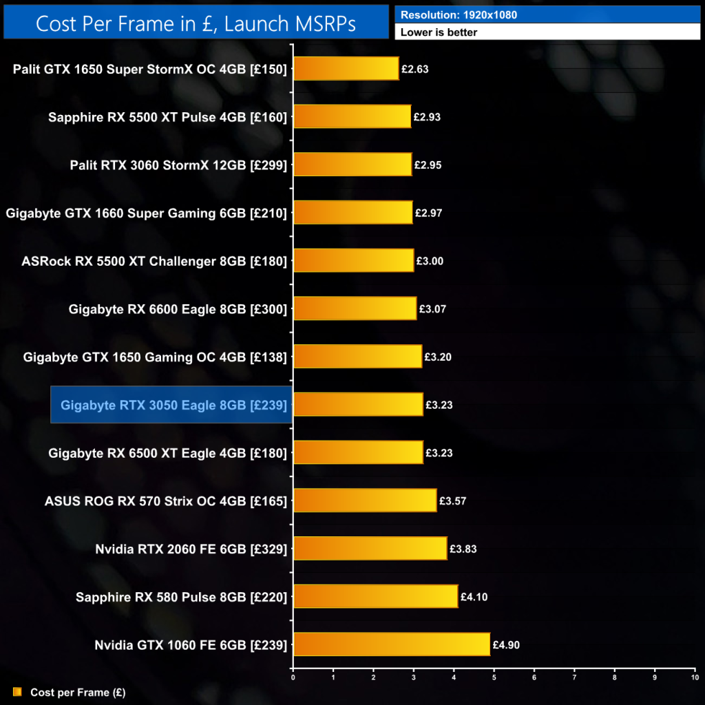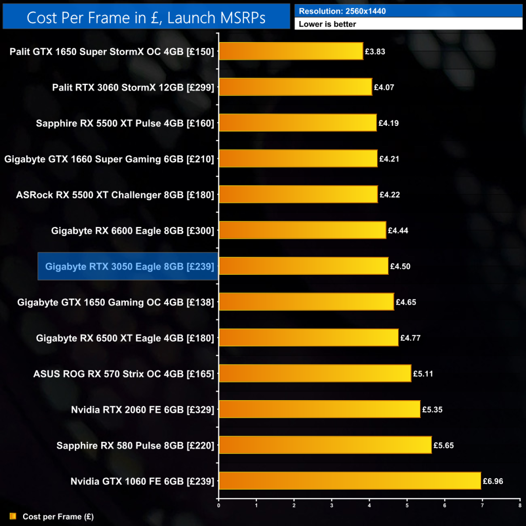 Cost per frame based on MSRP pricing is only useful in an academic sense these days, but it is interesting to look at nonetheless. It doesn't paint a pretty picture for the RTX 3050, with a cost per frame increase compared to the likes of the GTX 1660 Super and RTX 3060. Even the RX 6600 is offering superior value in terms of the rasterised performance, at both 1080p and 1440p resolutions.