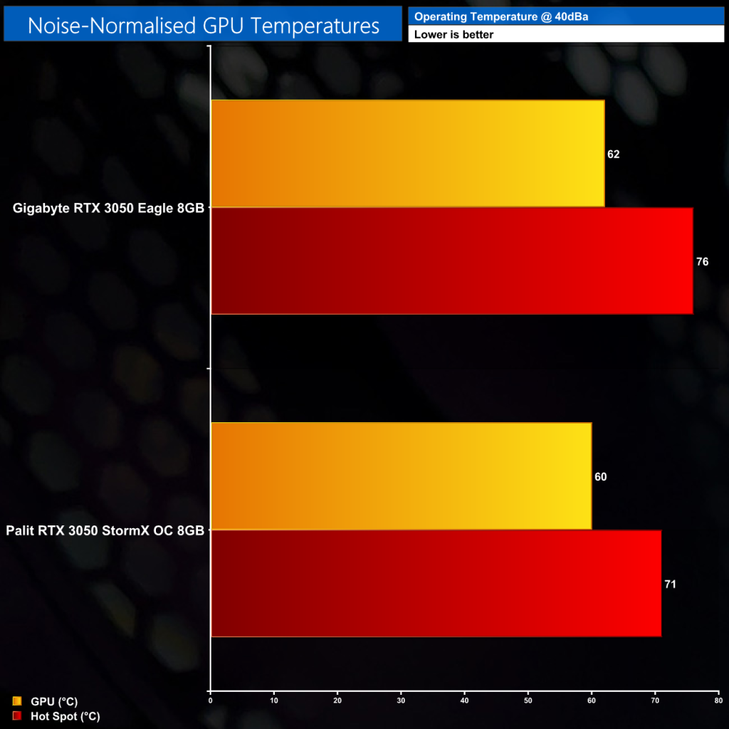To put all of that into perspective, our noise-normalised thermals do show us that the StormX OC's heatsink is the more efficient design. Both are absolutely good enough to cool an 130W RTX 3050, but the StormX OC ran 2C cooler on the GPU and 5C cooler for the hot spot temperature.