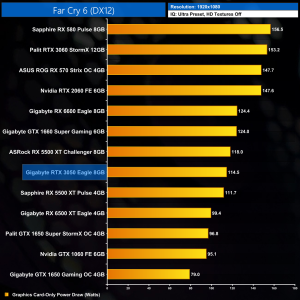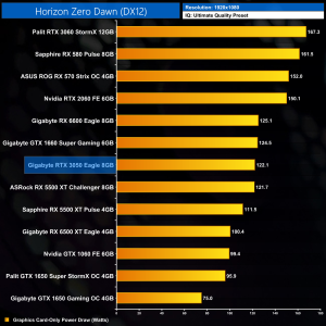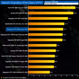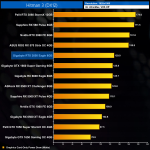 Over the twelve games we tested, the RTX 3050 averaged 119W power draw, meaning it is fractionally less power hungry than the GTX 1660 Super, and just a bit above the RX 5500 XT 8GB.