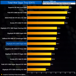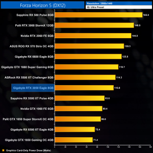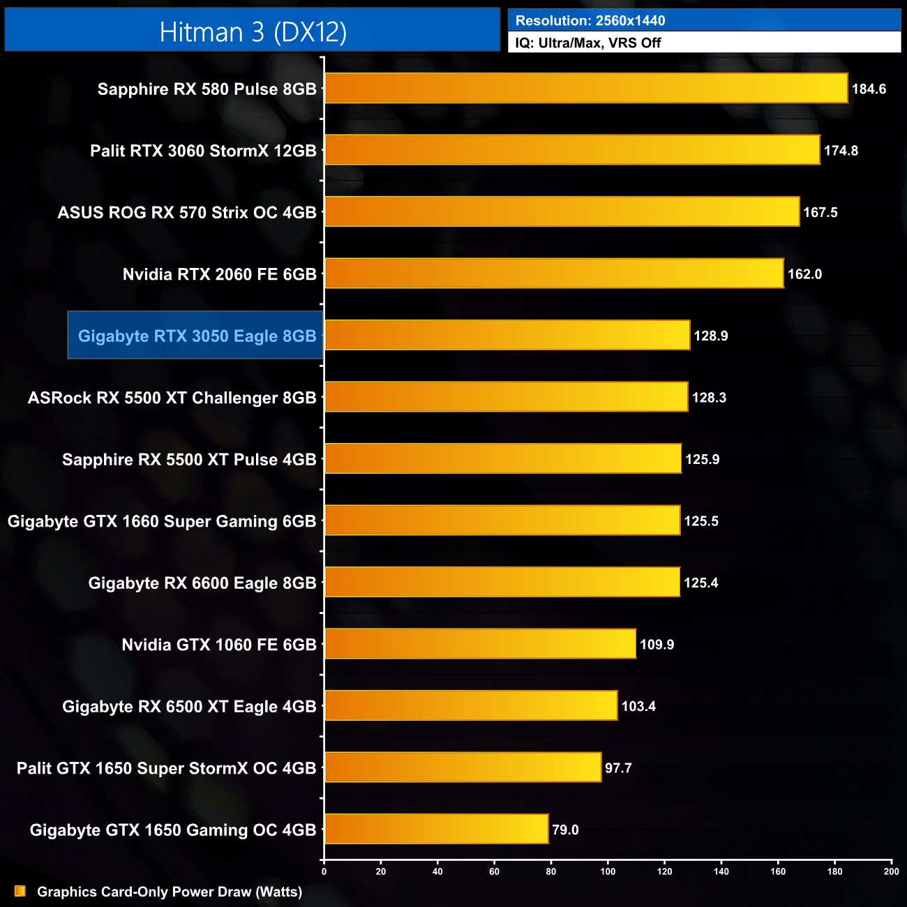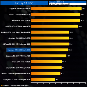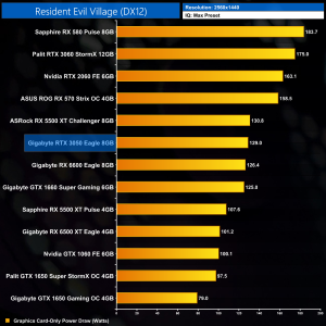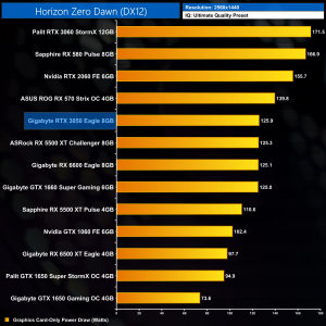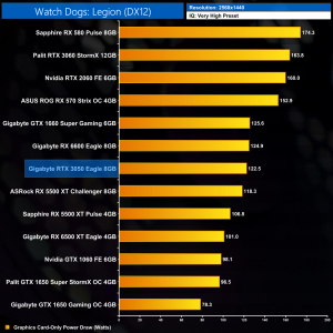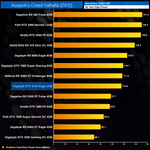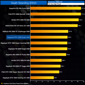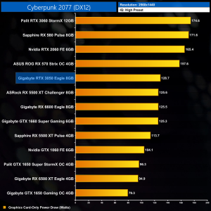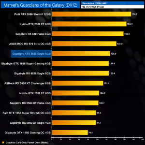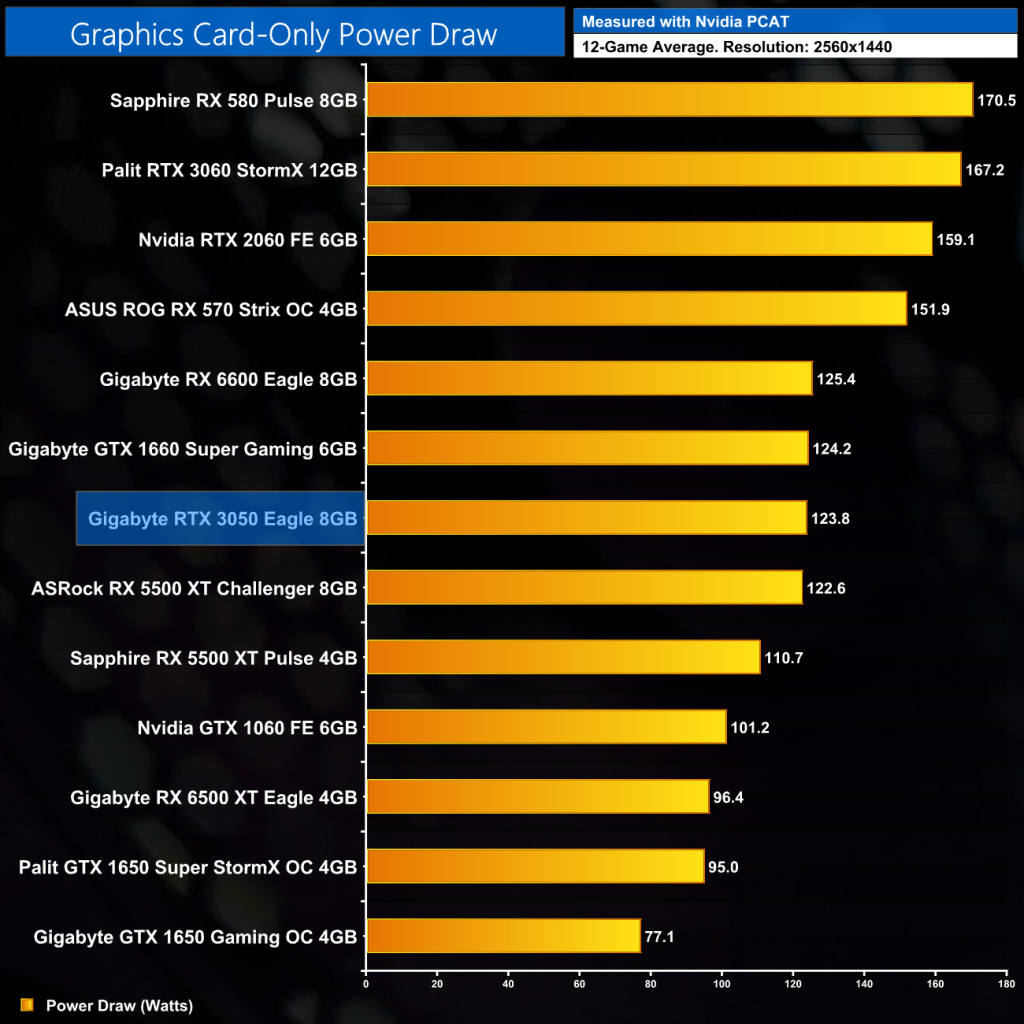 Average power draw does increase slightly at 1440p, up to 124W, putting the RTX 3050 within a single Watt of the GTX 1660 Super.