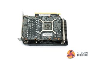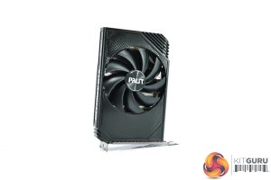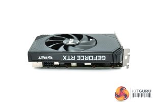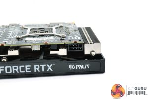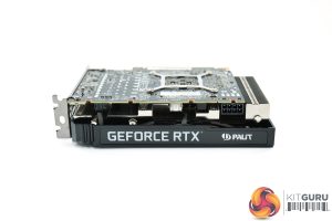 The side of the shroud is home to the GeForce RTX and Palit logos, but there is no backplate so we get a direct look at the back of the PCB.
