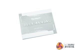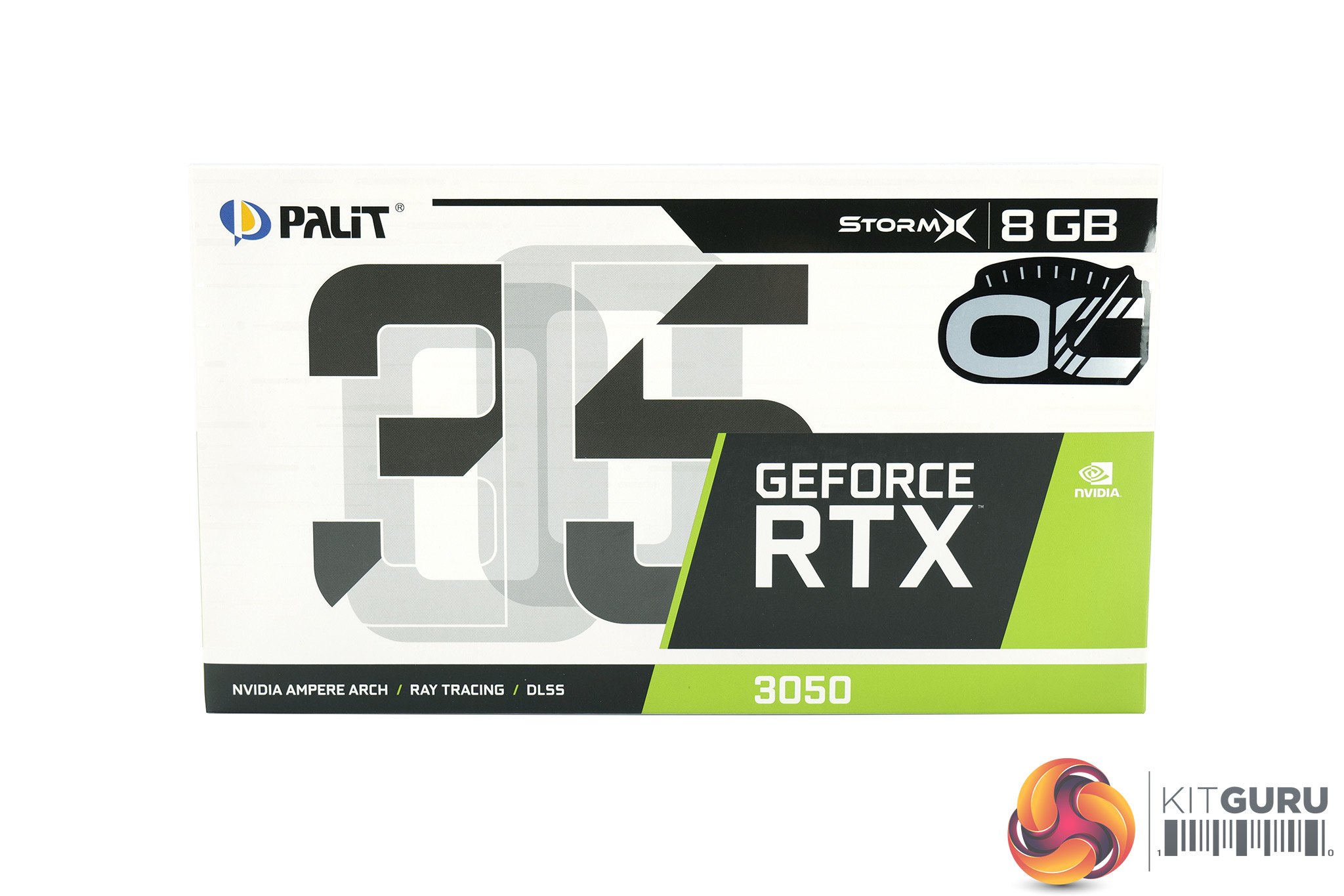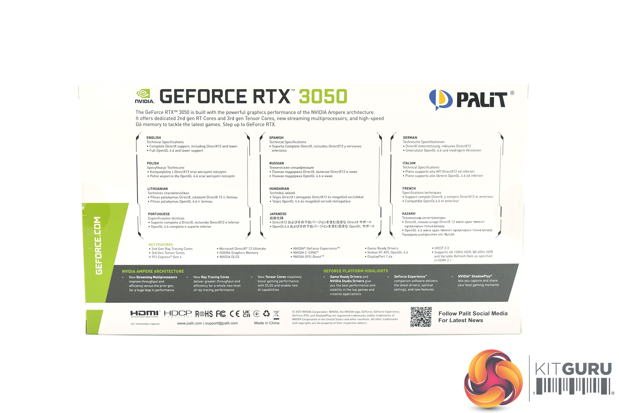 Palit's RTX 3050 StormX OC ships in a white box, with ‘3050' lettering visible on the front. On the back, a much of key features are listed in multi-lingual text.