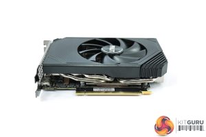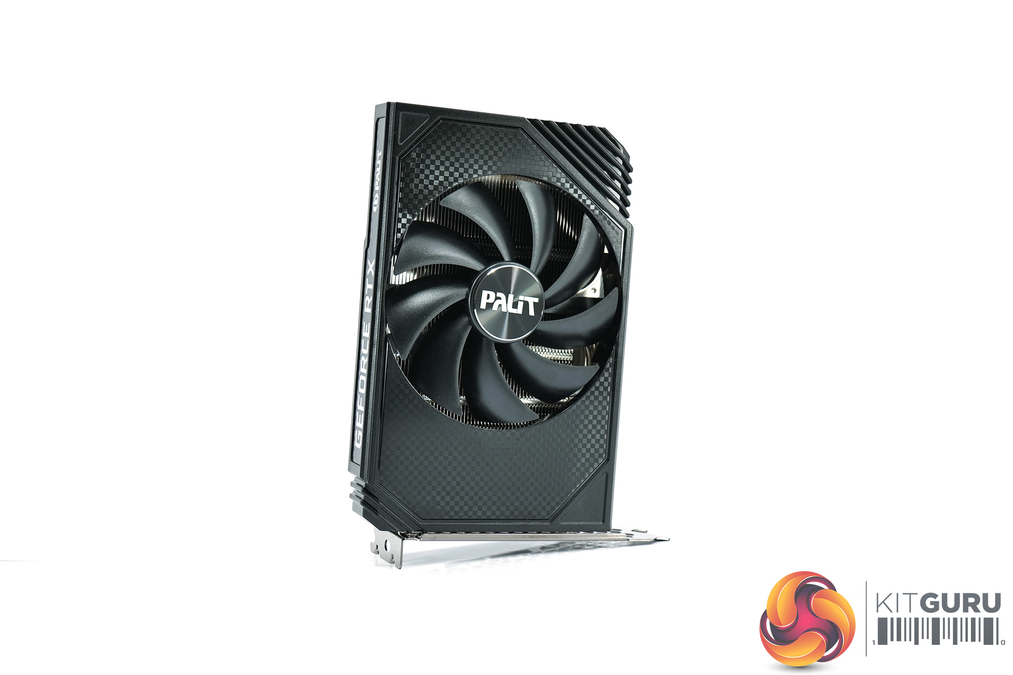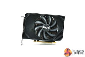 Looking at the card itself, the design is identical to the RTX 3060 StormX we looked at last year. That means we find a glossy, black plastic shroud with little in the way of design frills. A single 100mm fan dominates the front of the card.