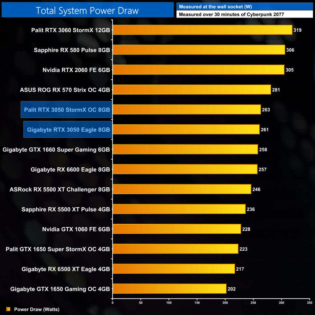 Both RTX 3050s we tested have the same 130W power limit, and total system power draw hit just over 260W for those cards.