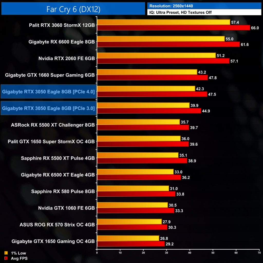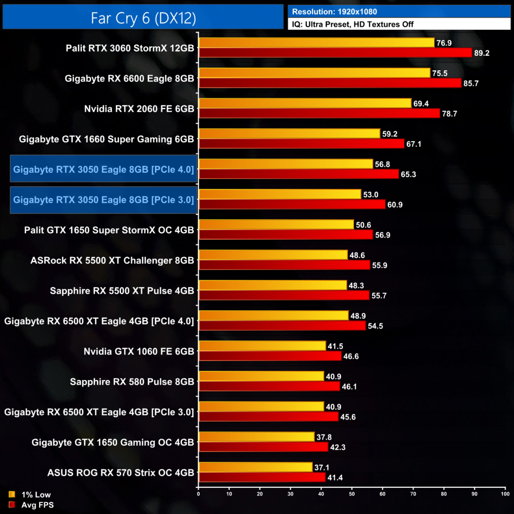 It’s more of the same in Far Cry 6. Here the RTX 3050 is just about slower than the 1660 Super, but there’s really not a lot in it. Looking at the PCIe 3.0 results however, the average frame rate is down 7% compared to PCIe 4.0, making it not much faster than the GTX 1650 Super if you have a PCIe Gen3 platform.