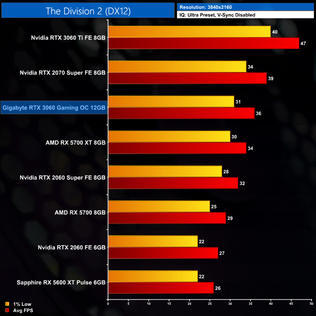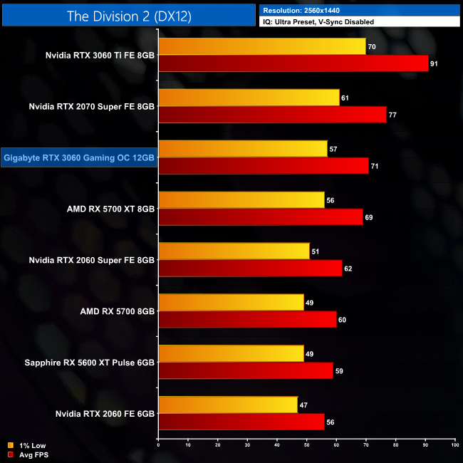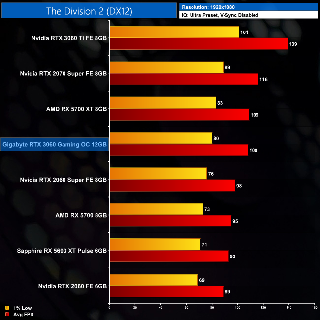 Moving onto The Division 2. Frame rates are higher in this game, averaging 108FPS at 1080p. This puts the RTX 3060 neck-and-neck with the RX 5700 XT, while it's a 10% improvement over the 2060 Super. Compared to vanilla 2060, we're talking a 21% FPS increase.