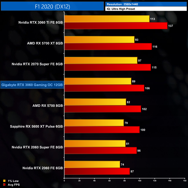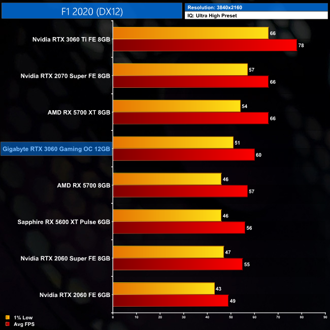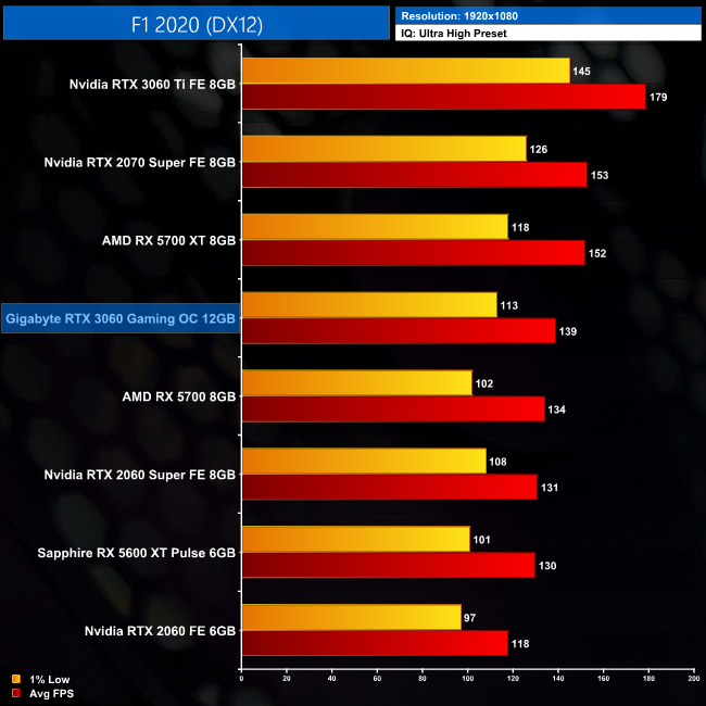 Frame rates get even higher in F1 2020, with the RTX 3060 almost managing 140FPS at 1080p. This puts it above both the RTX 2060 Super and RX 5700, but it's 9% slower than the RX 5700 XT. Gen-on-gen, we're looking at an 18% uplift versus the 2060.
