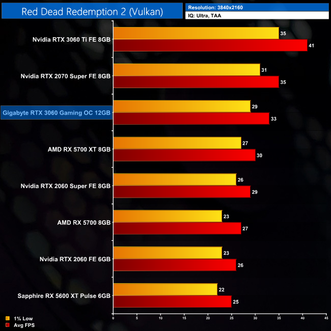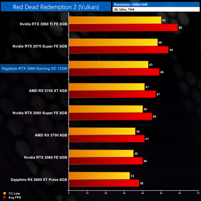Up at 1440p, I'd say Red Dead 2 is still very playable with the RTX 3060, averaging just under 50FPS. That's still 20% faster than the RX 5700, while it's also 4% ahead of the RX 5700 XT.