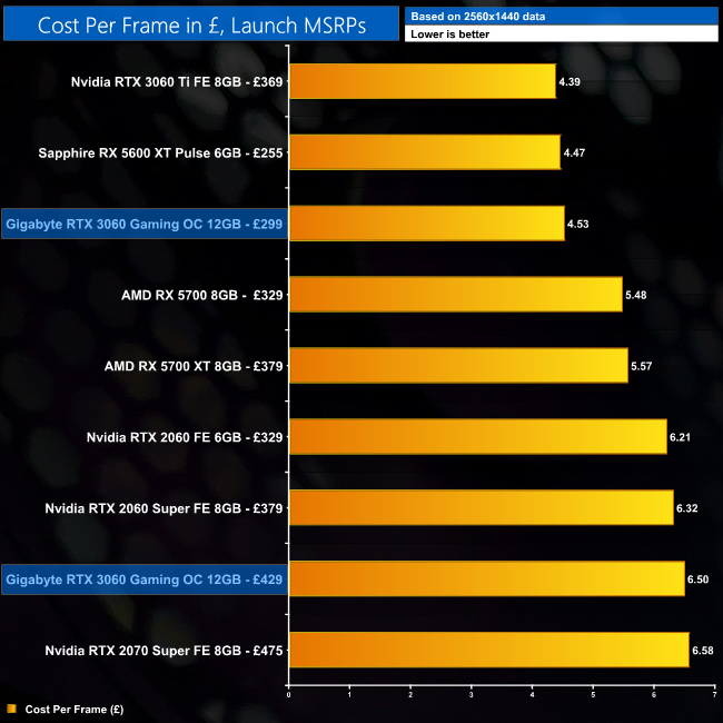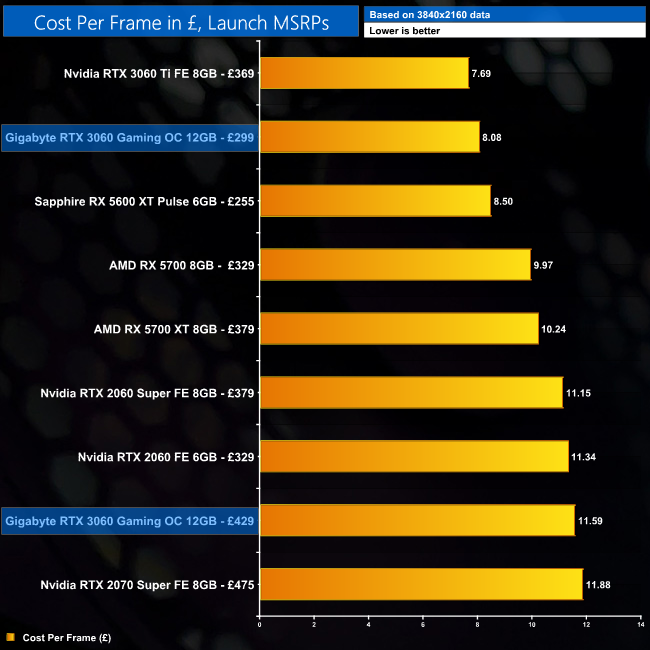 Cost per frame isn't a particularly useful metric at the minute given GPU prices are all over the place, and significantly higher than the given MSRPs, so consider these charts for ‘academic' purpose only. Nvidia's MSRP for the RTX 3060 is £299, while Gigabyte has told us this Gaming OC model has an MSRP of £429.99, which is obviously much higher. We've therefore included two data points for the GPU, to give you an idea of what sort of cost per frame we'd be looking at if GPUs were actually in stock.