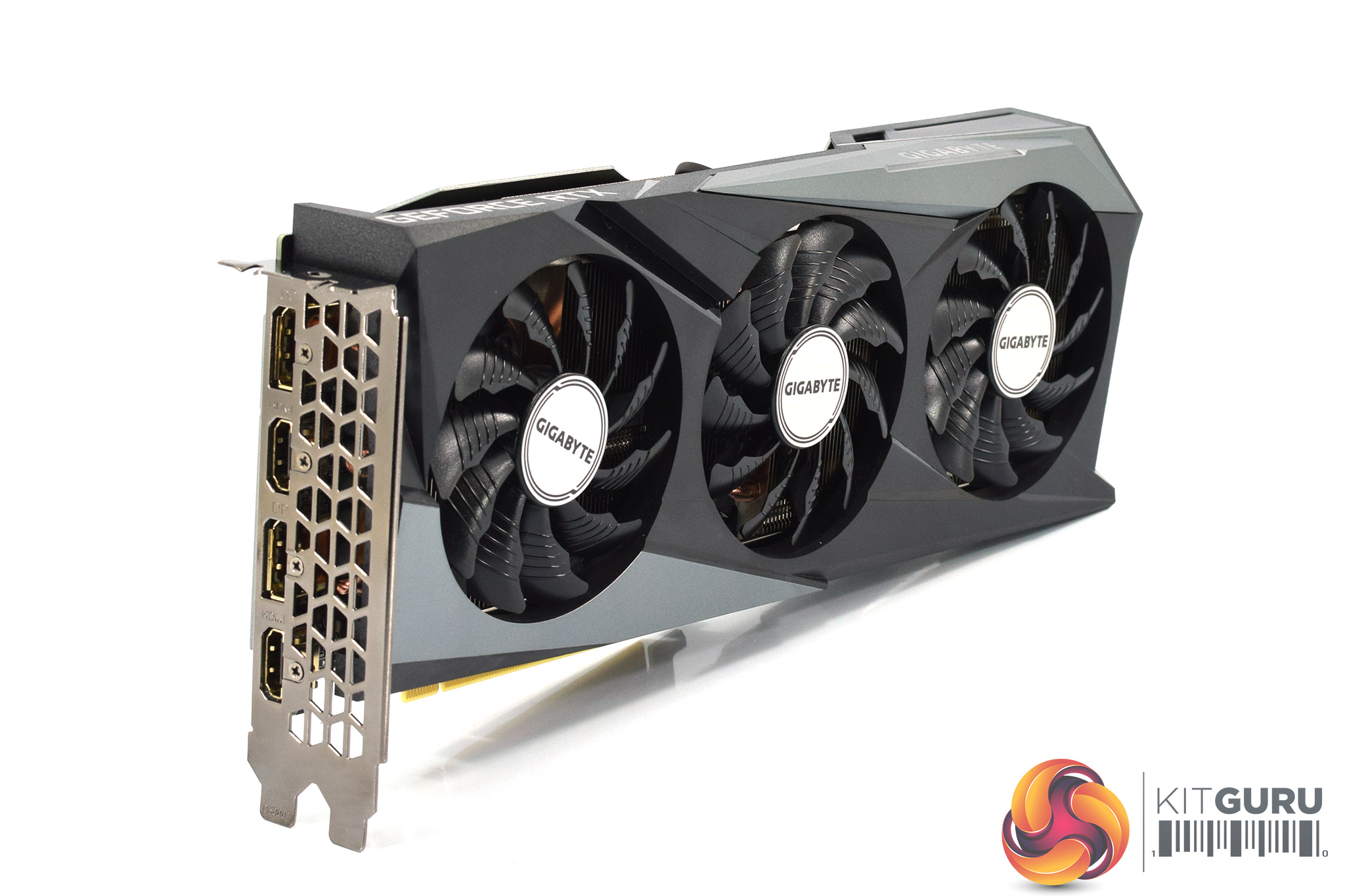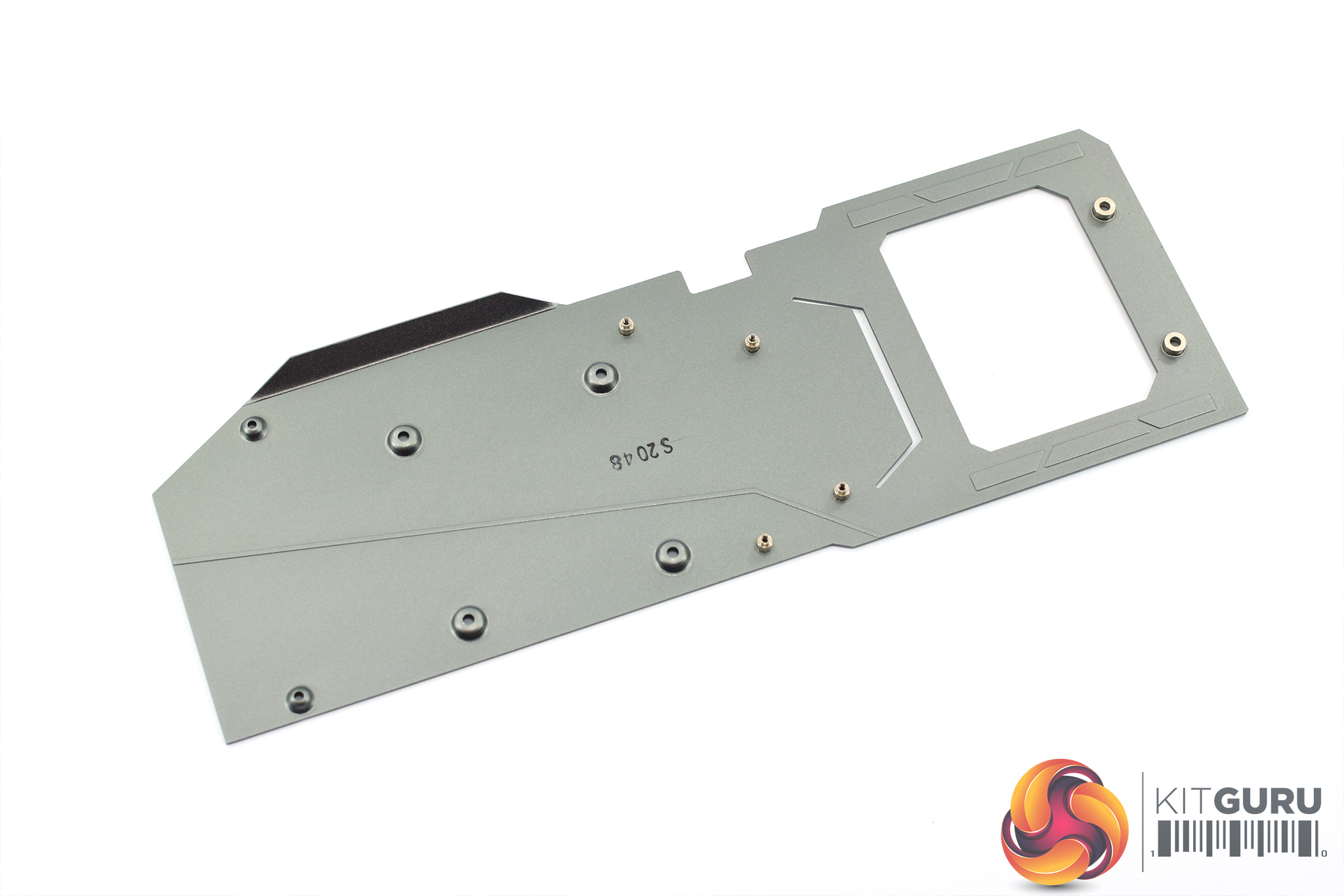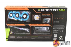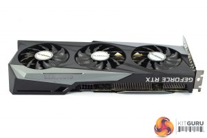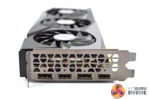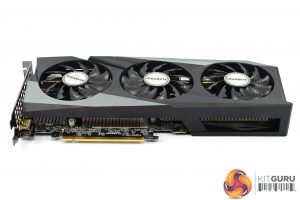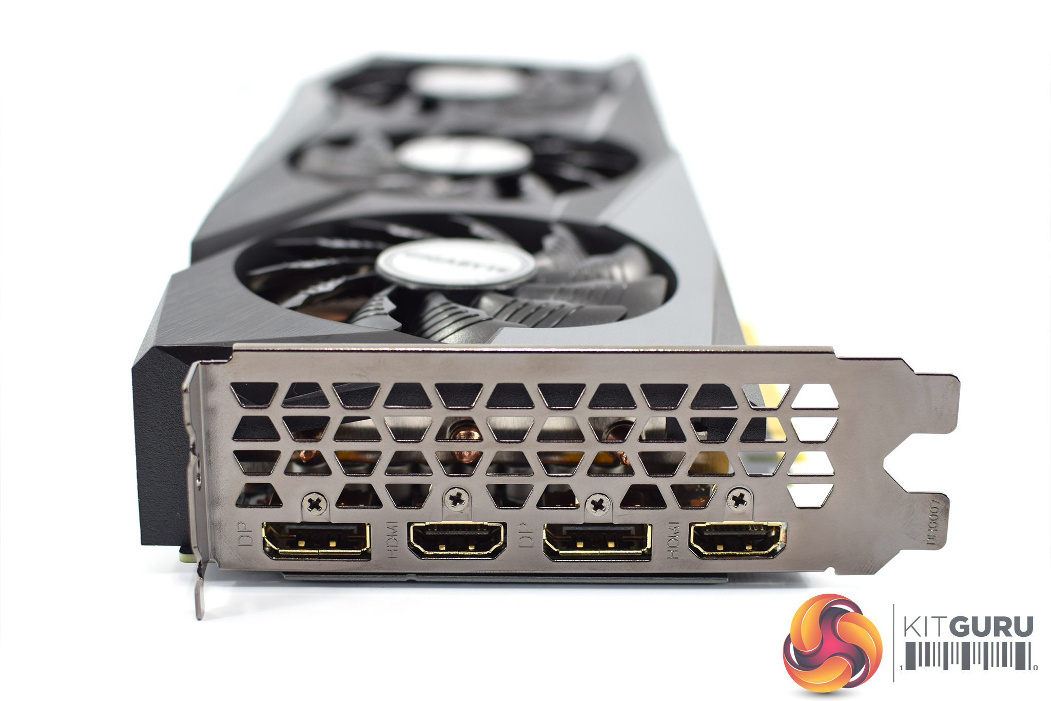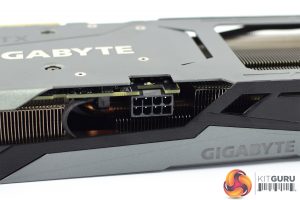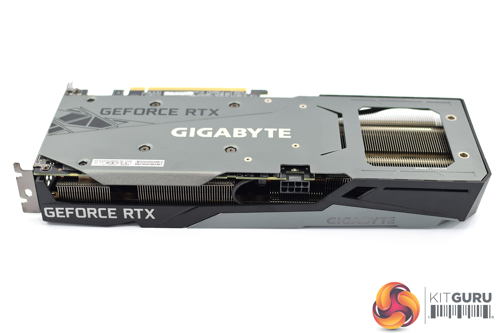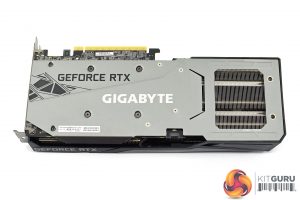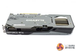 The backplate is a full-length metal design, in a greyish/silver colour. It features the Gigabyte branding printed in white text, just below the GeForce RTX branding. A large cut-out towards the end of the card is designed to allow airflow to pass directly through the heatsink.