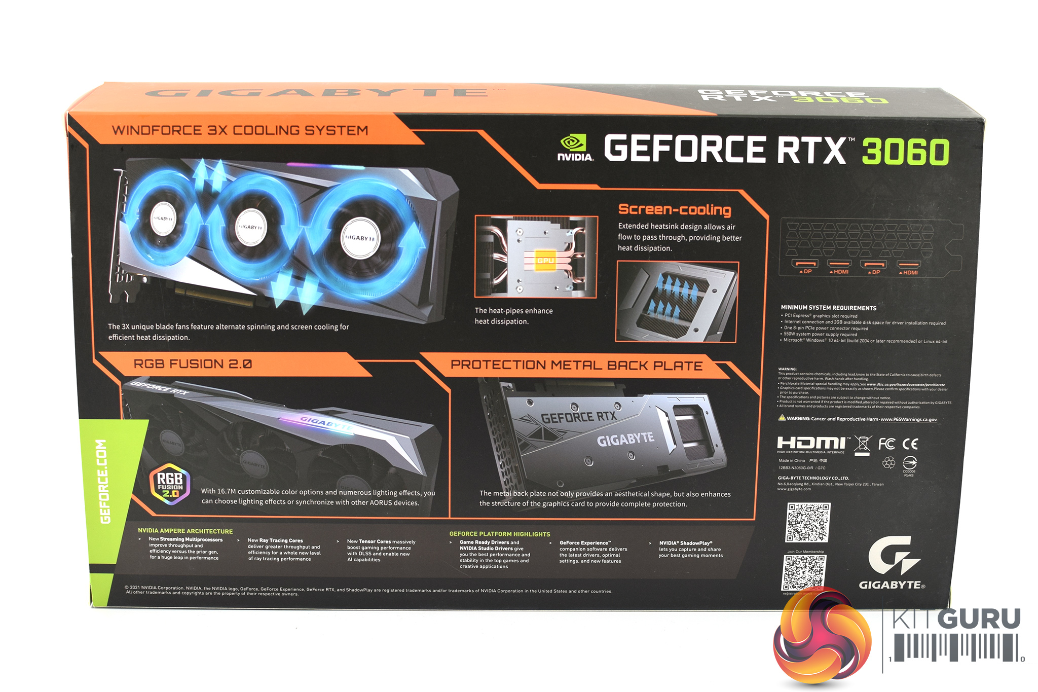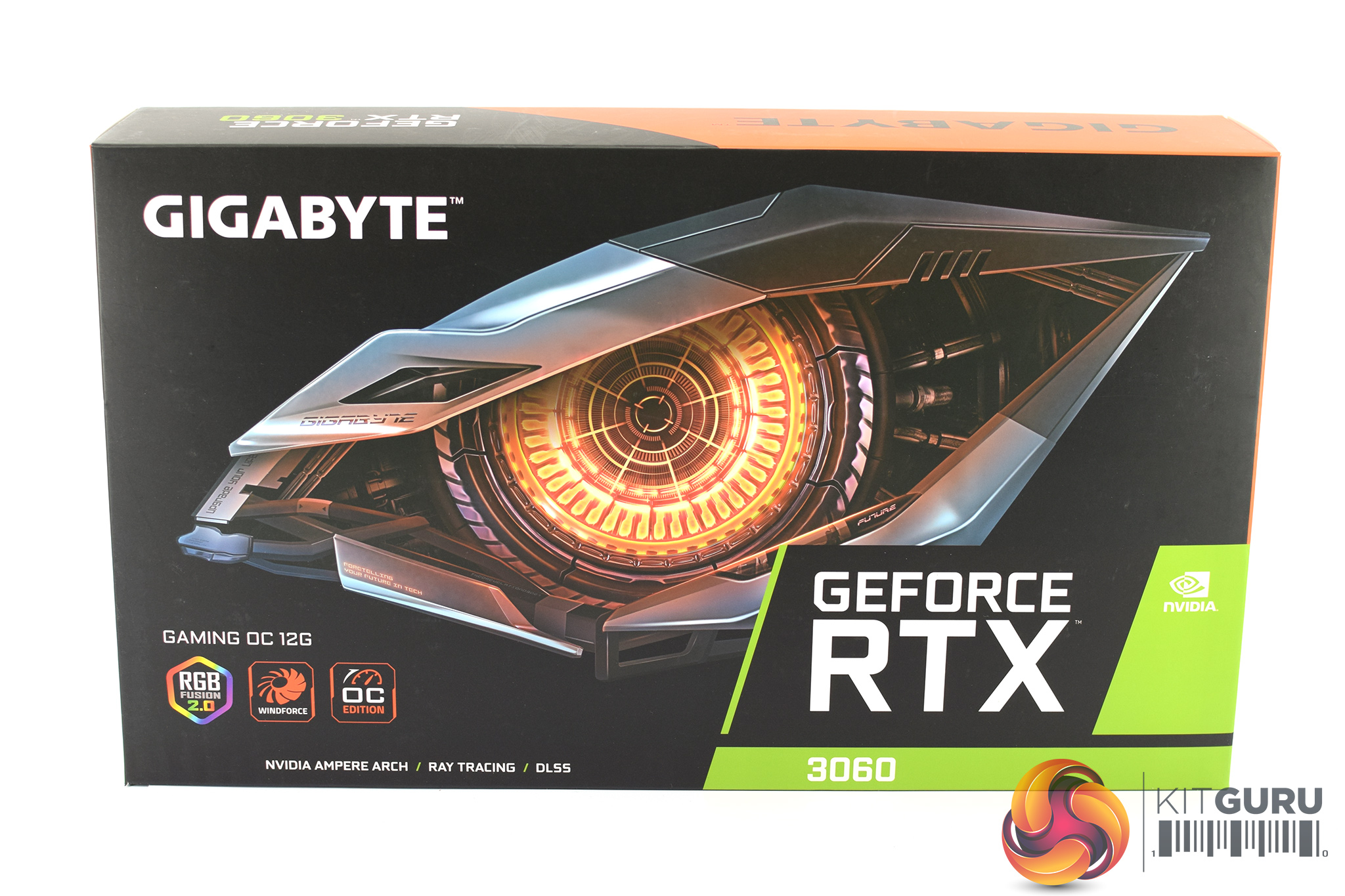 The Gigabyte RTX 3060 Gaming OC 12G ships in a black box, with Gigabyte's robotic eye logo dominating the front.