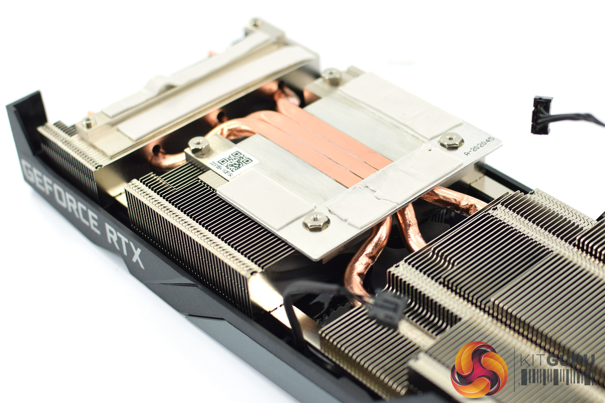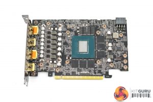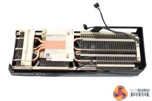 The cooler meanwhile is comprised of three aluminium fin stacks. These are connected by three 6mm copper heatpipes which make direct contact with the GPU die. The VRM and memory contact with separate plates on the heatsink via thermal pads.
