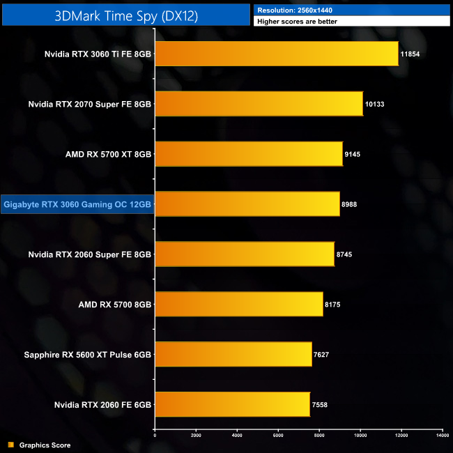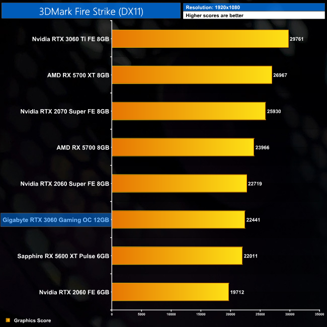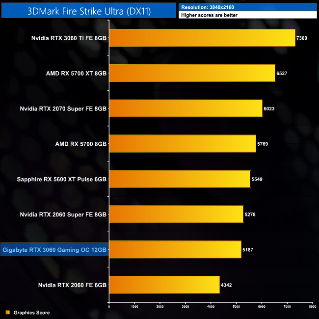 Our first performance indication comes from 3DMark. In Fire Strike, the RTX 3060 outperforms the RTX 2060 by 14%, and this rises to 19% in both Time Spy and Fire Strike Ultra.