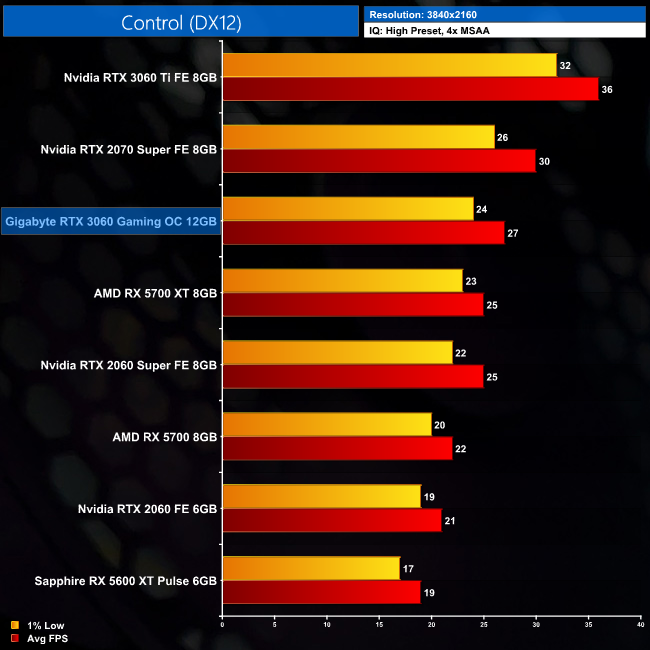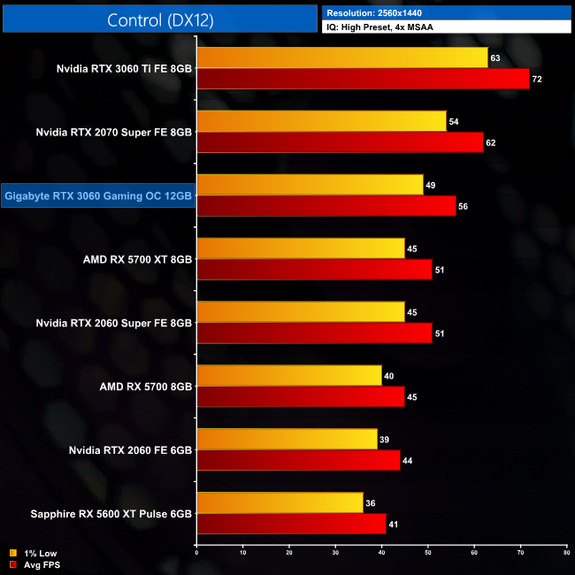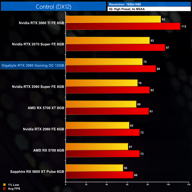 Moving onto Control, this Nvidia-sponsored title sees the RTX 3060 beating out both the RX 5700 and 5700 XT when testing at 1080p, as it hits 88FPS on average. That's a 22% uplift compared to both the RTX 2060 and RX 5700.
