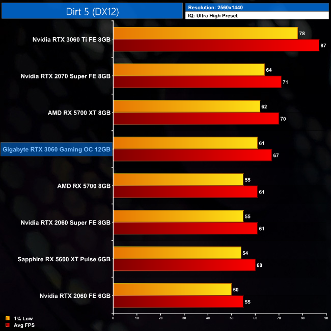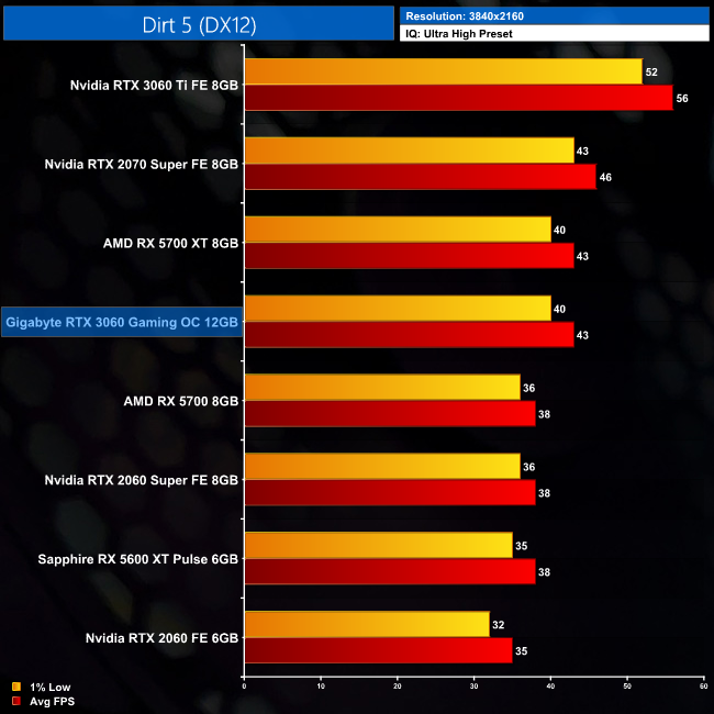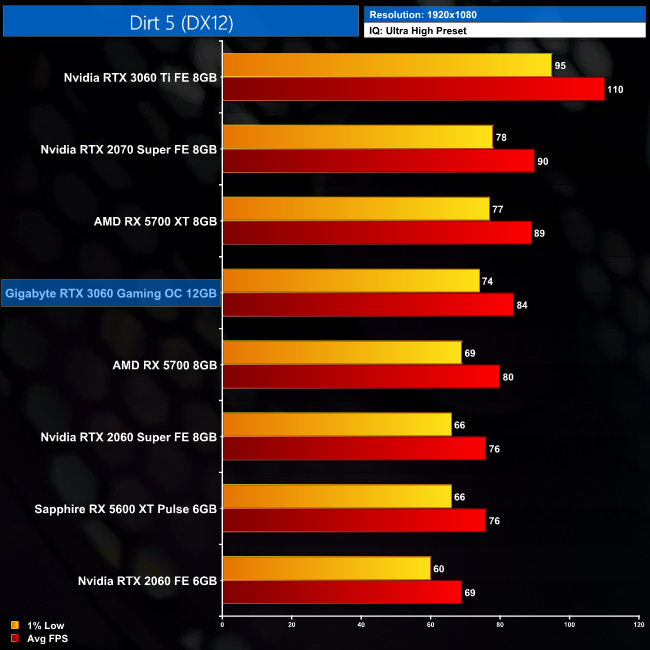 Dirt 5 is next and at 1080p, we're looking at a 22% uplift for the RTX 3060 when compared to its predecessor, the RTX 2060. It's still 5% faster than the RX 5700 in this AMD-sponsored title, but it's also 6% slower than the 5700 XT.