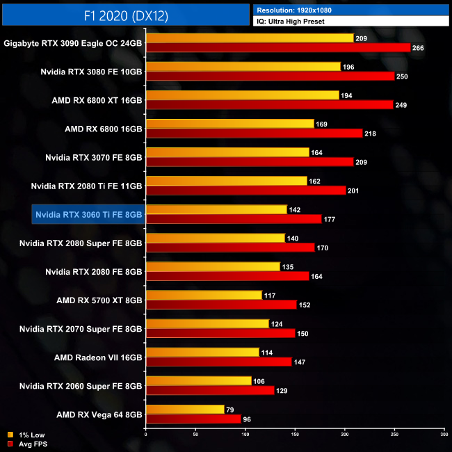 Now we come to F1 2020. This is another game where the 3060 Ti does well, delivering over 170FPS at 1080p. This gives it a 4% lead over the RTX 2080 Super, but a 37% lead over the 2060 Super.