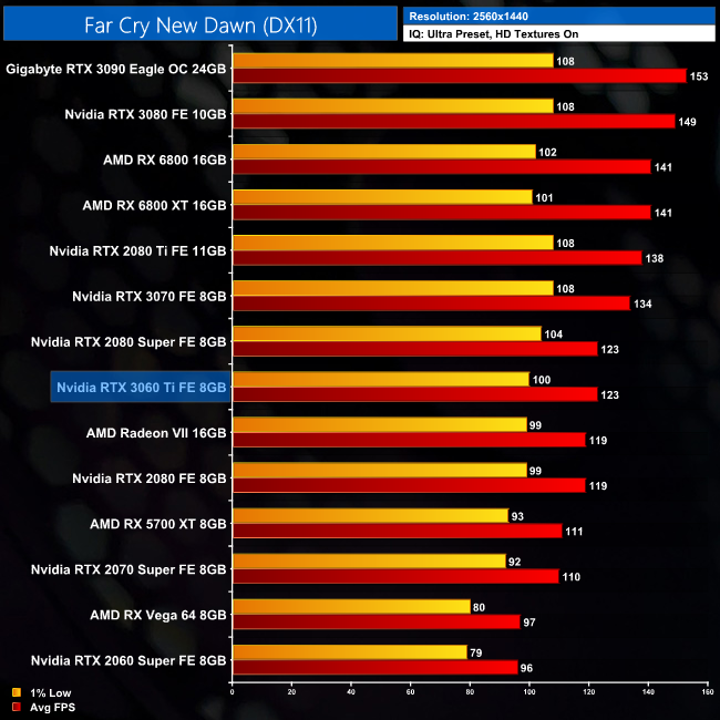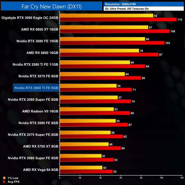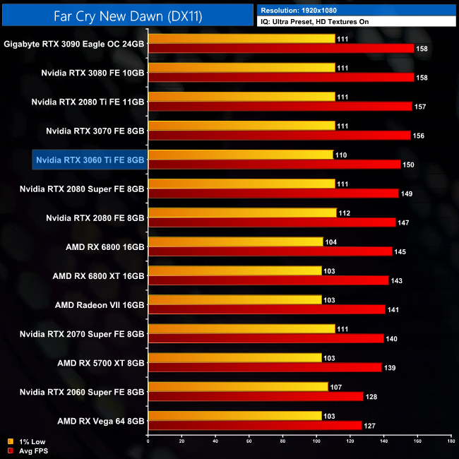 Now we come to Far Cry New Dawn, and due to a CPU-limitedness issue at 1080p, the results aren't all that useful. The 3060 Ti is only delivering 17% better performance than the 2060 Super, which clearly doesn't line up with the rest of our results.
