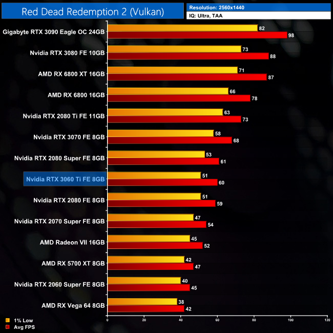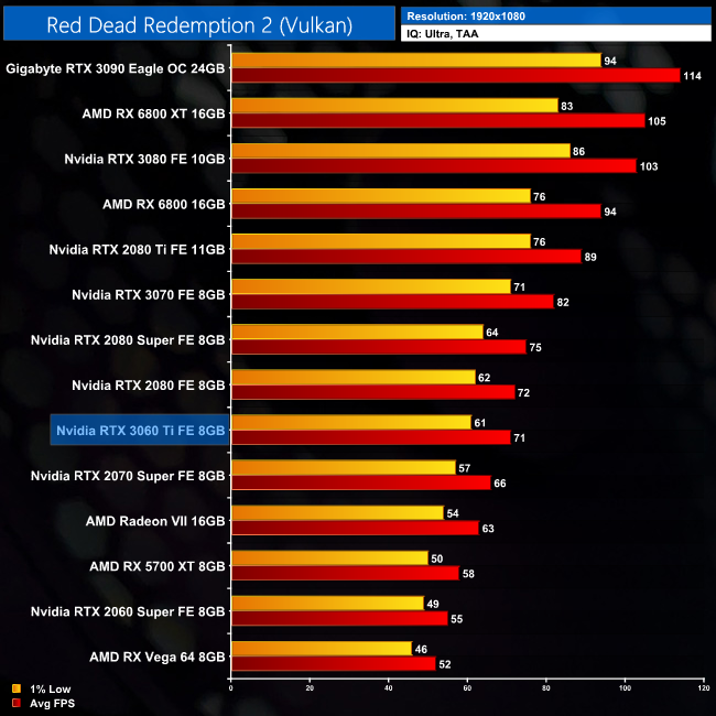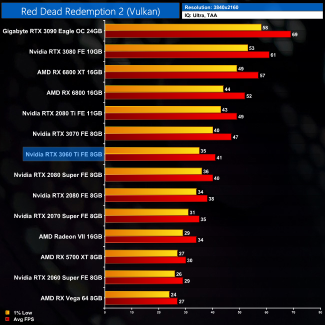 Next we come to Red Dead Redemption 2. Here, the 3060 Ti is 5% slower than the RTX 2080 Super at 1080p, which is actually the single biggest loss for the 3060 Ti we will see today, when compared to the 2080 Super.