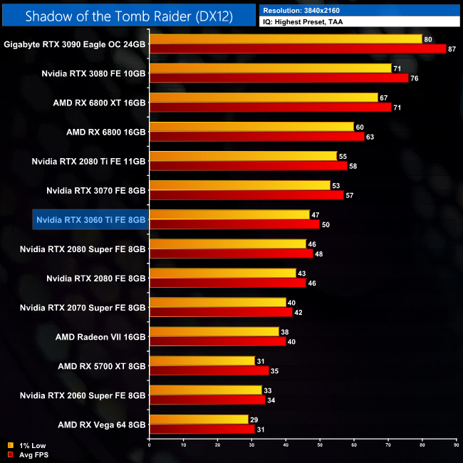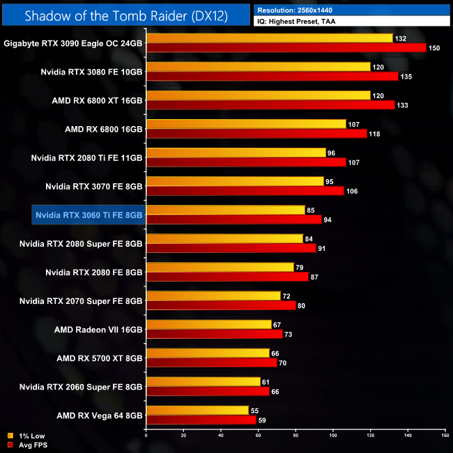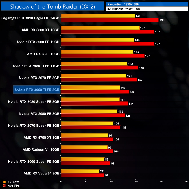 Coming now to Shadow of the Tomb Raider, things are neck and neck between the 3060 Ti and 2080 Super at 1080p, with just 2FPS separating the cards. The Ampere GPU is 37% faster than the 2060 Super, however.
