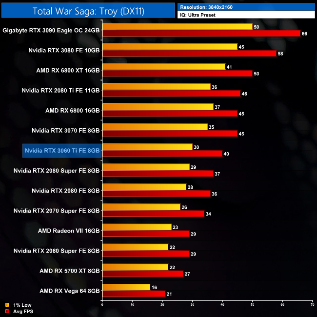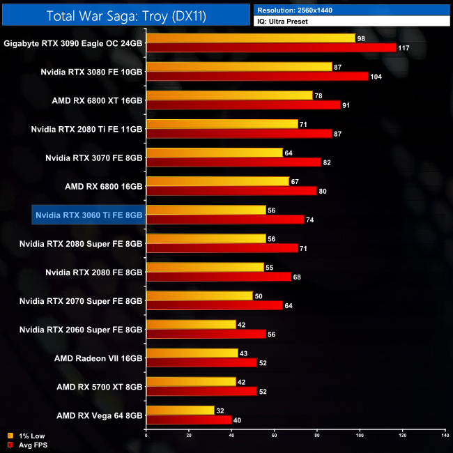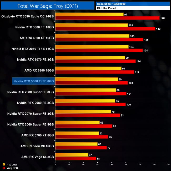 Our penultimate game is Total War Saga: Troy, and at 1080p we can see the 3060 Ti is actually just 8% slower than AMD's RX 6800, but I think that says more about how poorly AMD's GPUs do in this game than the 3060 Ti being particularly fast.