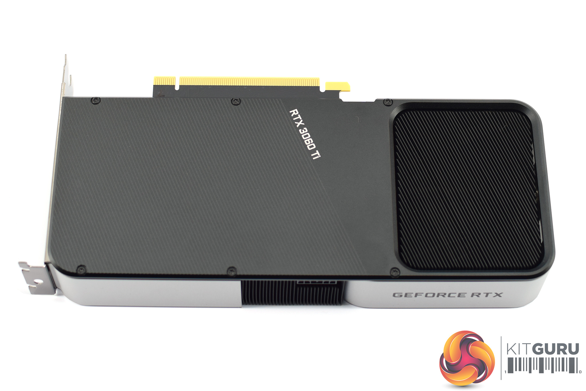 As for the backplate, it's the same design as the RTX 3070. That means it is left unmarked, apart from ‘RTX 3060 Ti' printed in small silver text. There's also a large cut-out to allow airflow from the right-side fan to pass straight through the heatsink and out into the chassis.