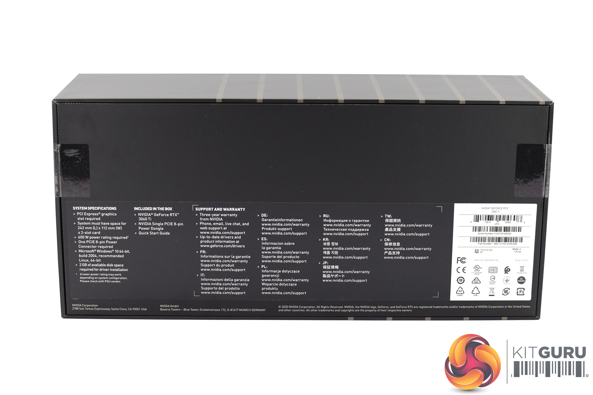 The RTX 3060 Ti Founders Edition ships in the same style of box we have seen from the other 30-series GPUs – it's almost entirely black, with some silver lines drawn on the front, with the GeForce branding visible in the top left corner.