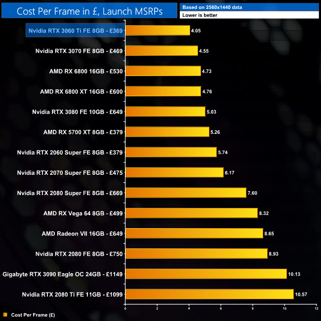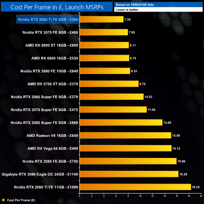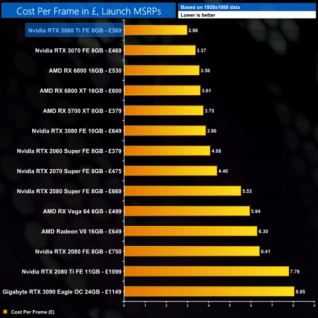 Based on the £369 UK MSRP, cost per frame for the RTX 3060 Ti is very favourable. At 1080p, it tops the chart, delivering one frame for every £2.98 spent. This is better value than even the RTX 3070, and marks a cost per frame reduction of 27% when compared to the 2060 Super.