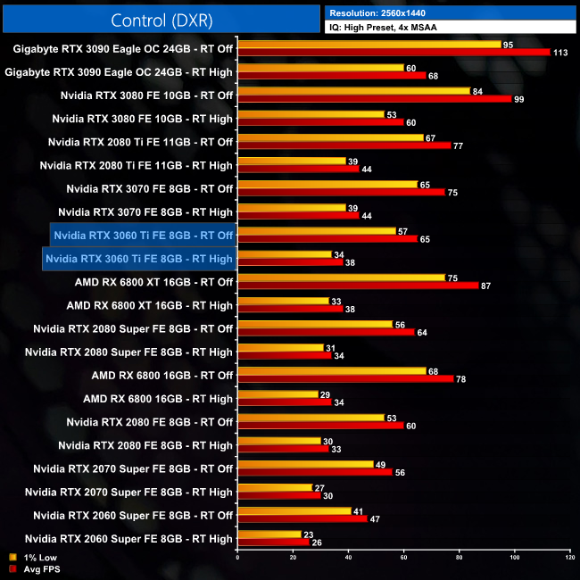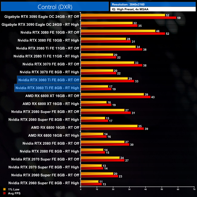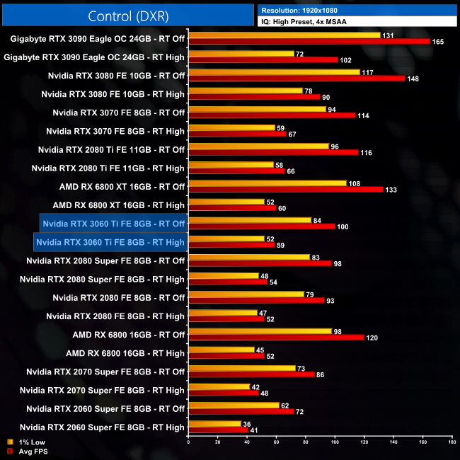 Starting with Control, this game is very heavy with its RT effects, and we can see a 41% performance hit when enabling that extra eye candy. The 3060 Ti is still ahead of the 2080 Super however, by 9%, and it’s actually only a single frame slower than AMD’s RX 6800 XT, which clearly shows how much further ahead Nvidia GPUs are.