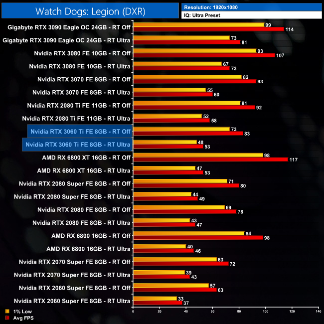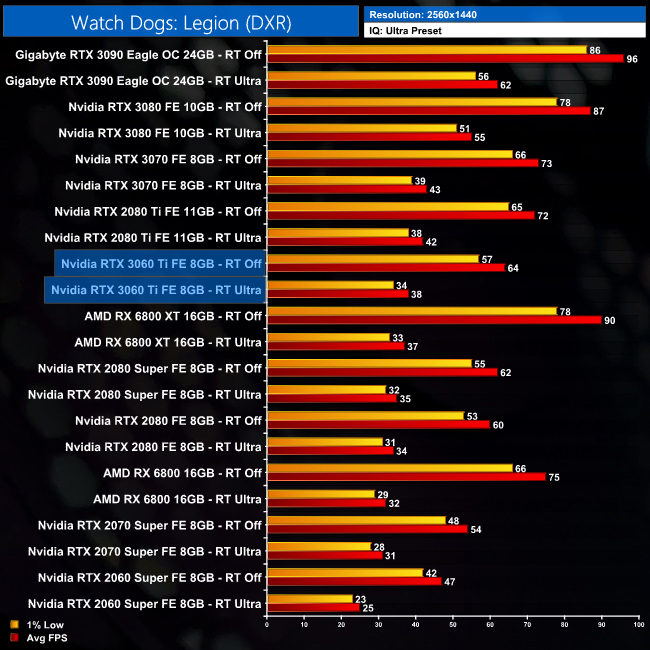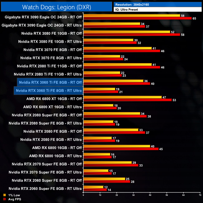 As for Watch Dogs: Legion, the ray traced reflections in this title lead to a frame rate drop of 36% for the RTX 3060 Ti. This is actually on par with the RX 6800 XT, and remember that GPU starts at £650, while the 3060 Ti is also 8% faster than the 2080 Super with ray tracing enabled.
