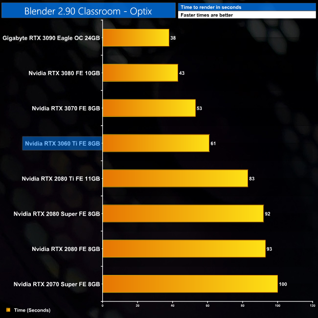 Using OptiX, the 3060 Ti reduces the render time by 34% when compared to the 2080 Super.
