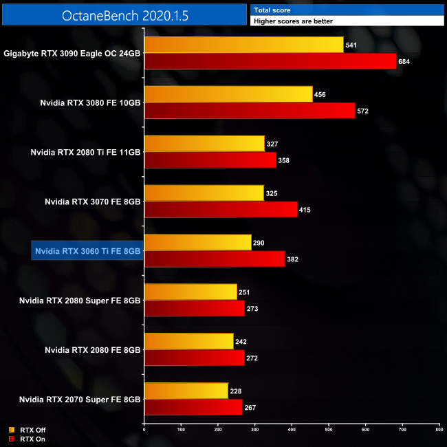 As for OctaneBench, the RTX 3060 Ti improves on the RTX 2080 Super significantly. Its score is 16% higher with RTX off, but 40% higher when RTX is turned on.