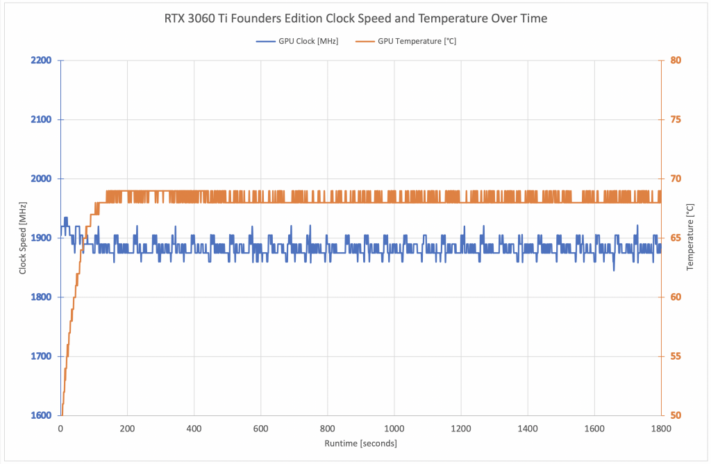 Looking now at the clock speed of the RTX 3060 Ti Founders Edition, we can see overall behaviour is very similar to the RTX 3070 here. After an initial spike, the GPU’s frequency hovered just below the 1900MHz mark, with the occasional boost over 1900MHz every now and again.