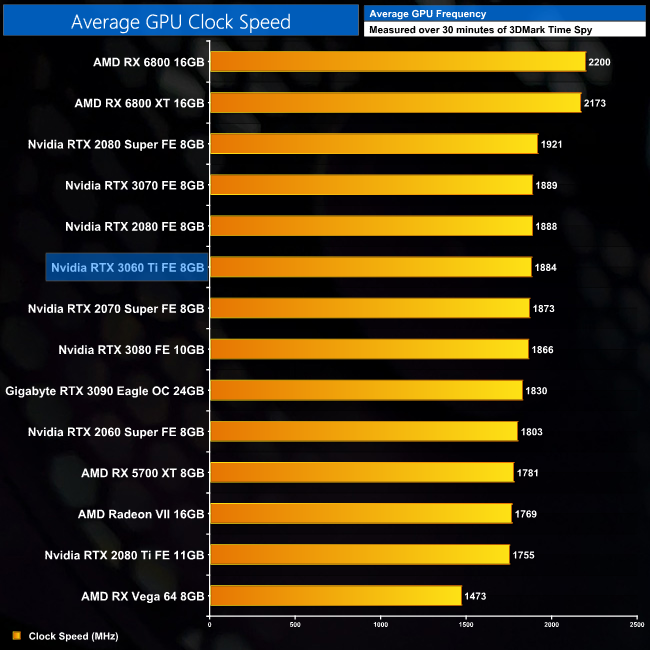 Across our 30 minute stress test, the GPU recorded an average frequency of 1884MHz, which is pretty much in-line with what we'd expect from a Founders Edition card. We will have to wait and see what Nvidia’s partners can do to improve on this.