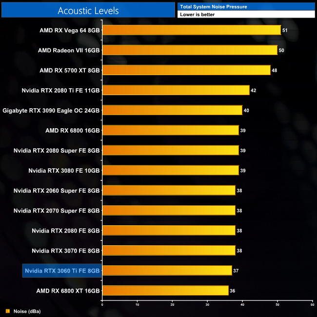 Interestingly enough, the RTX 3060 Ti also proved marginally quieter. In our testing, the RTX 3070 Founders Edition ran its fans at 1700rpm, while for the 3060 Ti, it kept them slightly slower at 1530rpm. That resulted in noise levels decreasing by 1dba, which the human ear would be unlikely to notice, but it was picked up by our sound meter.