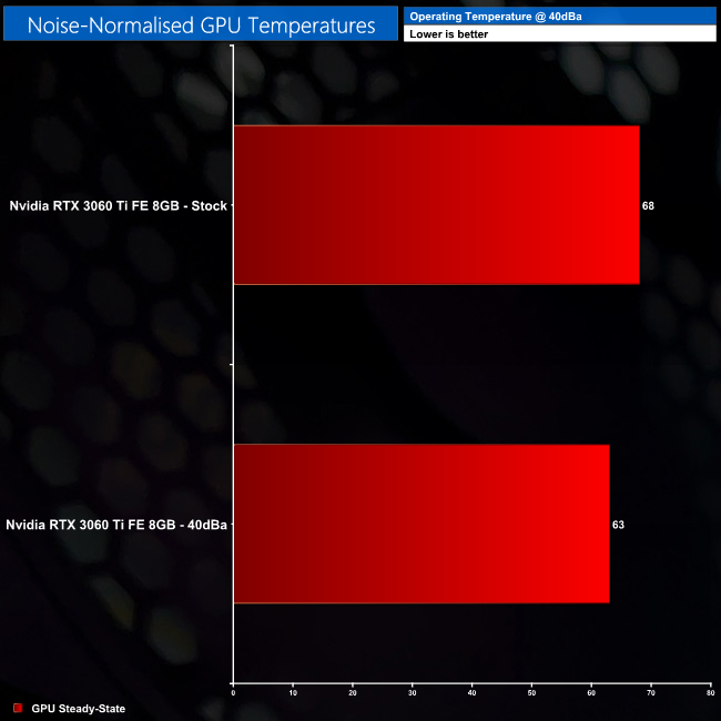 Noise-normalising to 40dba required the RTX 3060 Ti's fans to spin at 1980rpm – an increase of 450rpm over stock behaviour. This resulted in GPU thermals dropping by 5C, and while we haven’t tested any AIB cards yet, we will use this result as a baseline to see how Nvidia’s partners can improve on the Founders Edition cooler.