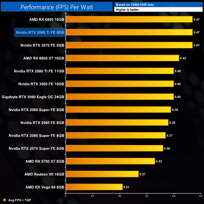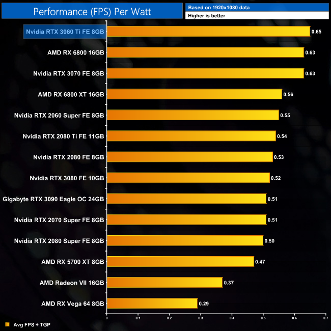 For 1080p gaming, the RTX 3060 Ti is the most efficient GPU we have tested to-date. It's not a big improvement on the RTX 3070 or RX 6800 – not at all, as it's FPS per Watt is just 3% higher. But it is still the more efficient GPU.