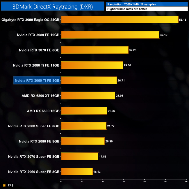 Looking at pure ray tracing-only performance – with no rasterisation – sees the RTX 3060 Ti outpace even AMD's RX 6800 XT, which is impressive. The Ampere GPU is also 23% faster than the RTX 2080 Super here, and a whopping 77% faster than the RTX 2060 Super.