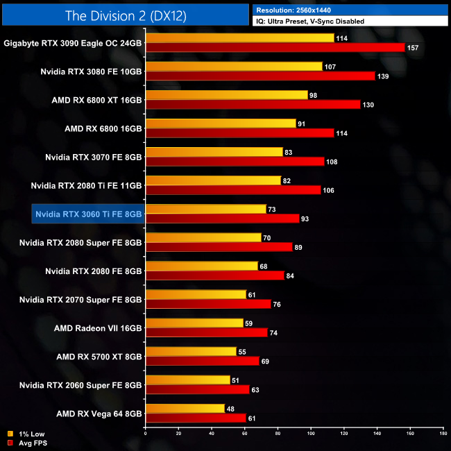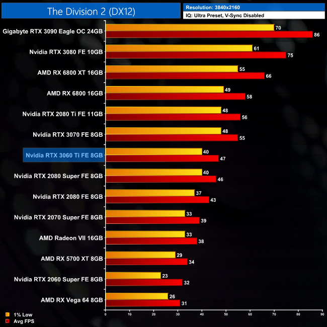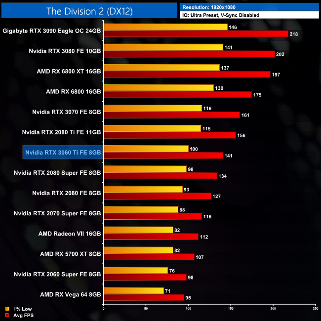 Next up we have The Division 2. We've noticed how this game seems to really like the Ampere architecture, and we can see the RTX 3060 Ti deliver gains of 44% over the RTX 2060 Super at 1080p, and that's the biggest difference between those GPUs we will see at this resolution.