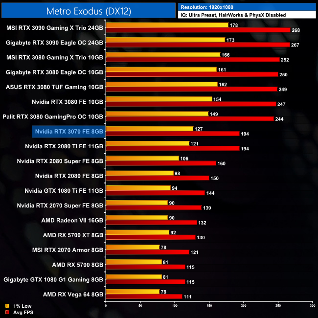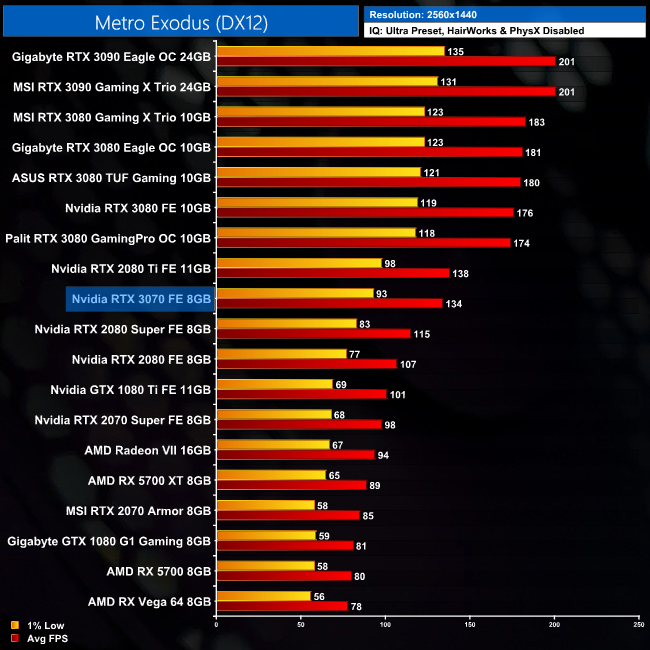 Next up we come to Metro Exodus, which paints a more positive picture for the 3070 than Ghost Recon: Breakpoint. At 1440p, this new Ampere GPU outperforms the RTX 2070 by 58%, as it hits 134FPS on average. This is 3% slower than the 2080 Ti.