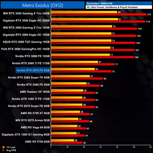 As we step up to 4K, the RTX 2080 Ti pulls slightly further ahead – not by a lot, but the 3070 is 5% slower. Compared to the 2070, it is still 59% faster at this resolution.