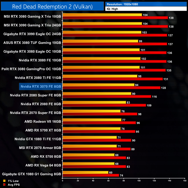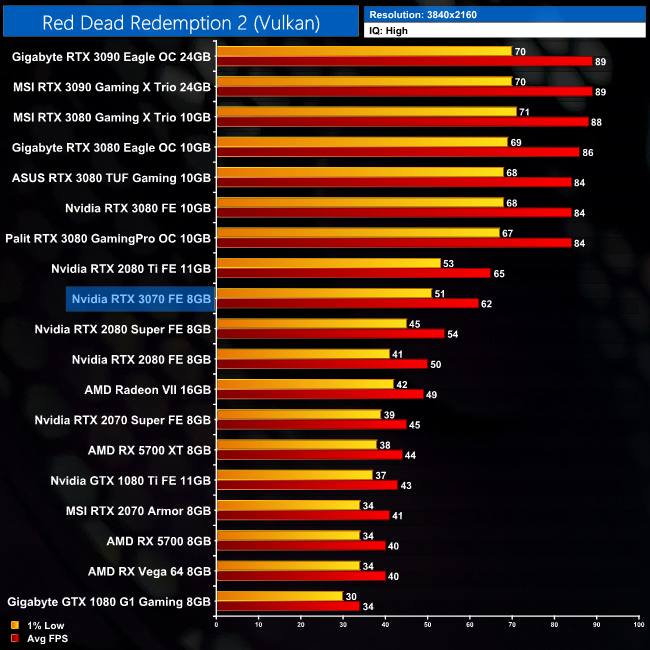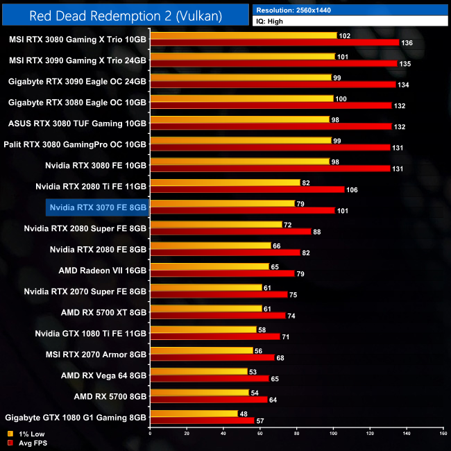 Red Dead Redemption 2 is actually pretty similar to Shadow of War in terms of its overall trend. At 1440p, the RTX 3070 is 49% faster than the RTX 2070, but 5% slower than the 2080 Ti.