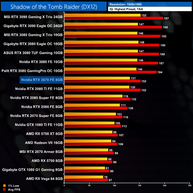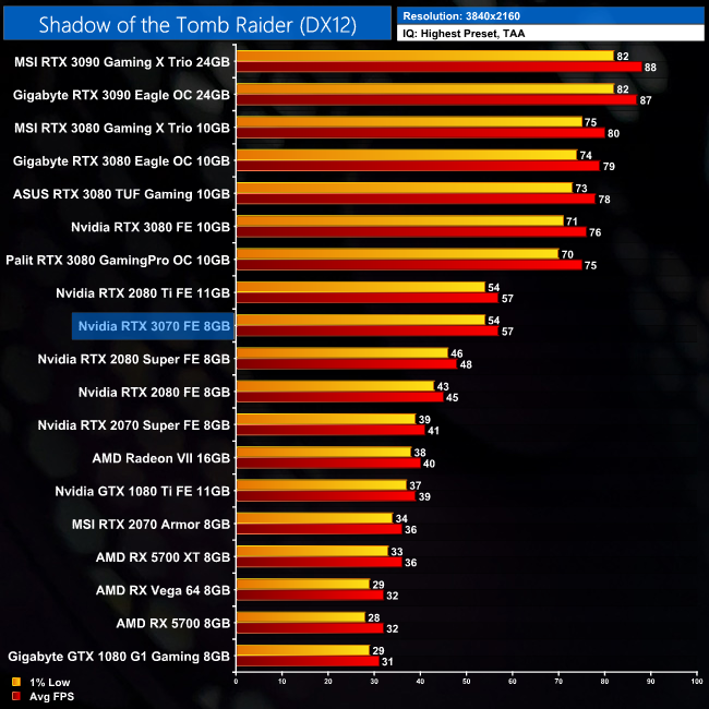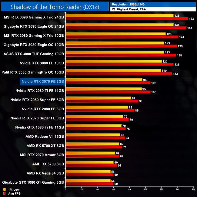 Our penultimate game is Shadow of the Tomb Raider, which sees the RTX 3070 average over 100FPS at 1440p. This puts it 58% ahead of the RTX 2070, while it is a dead heat with the RTX 2080 Ti.