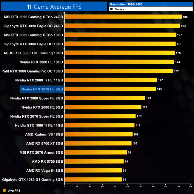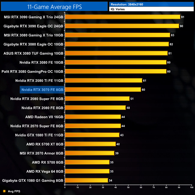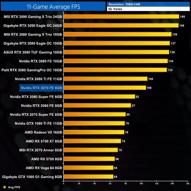 Looking at the overall performance figures, the first trend to discuss is how the 3070 stacks up against the 2080 Ti. As we saw, it wins in some games and loses in others, but taken across the 11 games we tested today, RTX 3070 is 2% slower at 1440p and 4K. That's close enough where I'd call the performance essentially identical, and do bear in mind we're comparing the 3070 Founders Edition, which comes at stock clocks, to the 2080 Ti Founders Edition, which is actually factory overclocked.