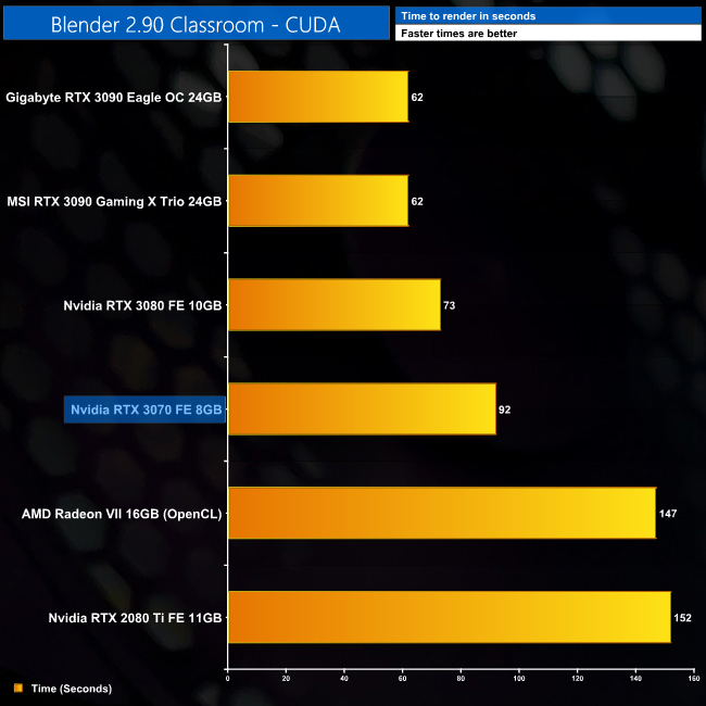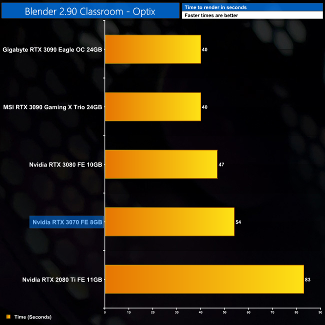 Blender rendering performance is strong for the RTX 3070. Using CUDA, it offers a huge 39% reduction in total render times compared to the RTX 2080 Ti, while it takes 26% longer than the RTX 3080. Using Optix instead of CUDA sees the 3070 reduce the overall render time by 35% when compared to the 2080 Ti.