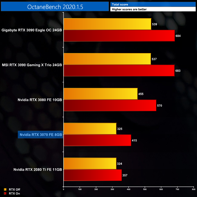 As for Octane, render performance for the RTX 3070 with RTX Off is bang in line with the RTX 2080 Ti. The RTX 3070 does pull ahead when RTX is enabled, though, with its score increasing by 16%.