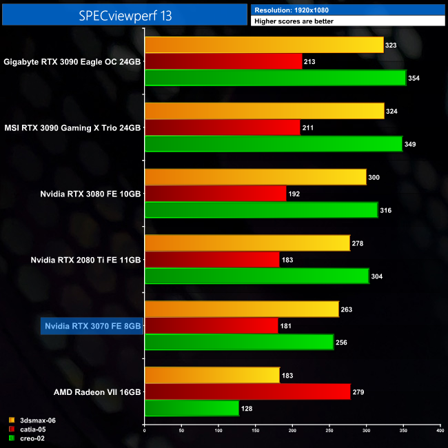 For the three tests we look at in SPECviewperf 13, the RTX 3070 trends slightly behind the RTX 2080 Ti – it's 5% slower in 3dsmax-06, and 16% slower in creo-02. Finally, catia-05 sees effectively no difference between the two GPUs.