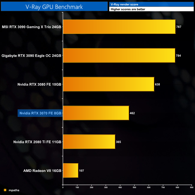 Lastly, we come to V-Ray. Here, the RTX 3070 delivers a render score of 462, an improvement of 27% compared to the RTX 2080 Ti.