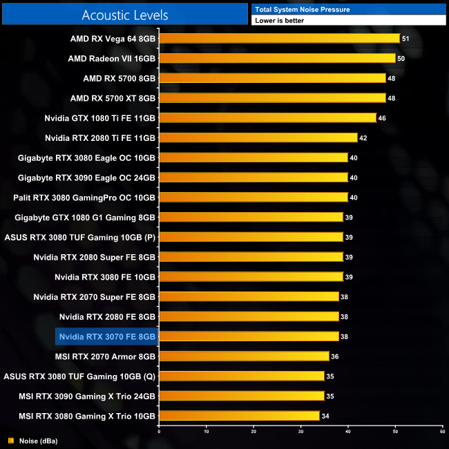 We've established the RTX 3070 Founders Edition runs cool, and it runs very quiet as well. We measured noise output at 38dBa, with the fans spinning at 48%, or 1700rpm. This may not be as class-leading as some of the aftermarket cards we have reviewed, but it is still very easy on the ears and is simply not bothersome while gaming.