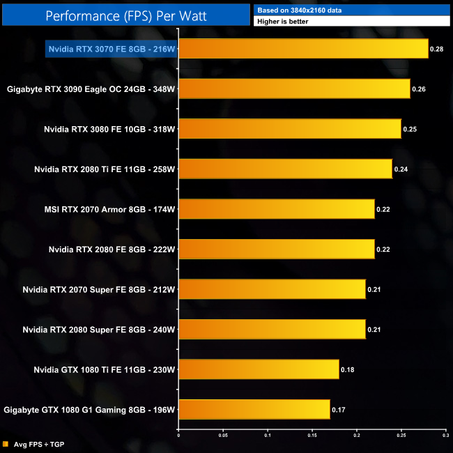 RTX 3070 sets a new standard for performance efficiency, delivering 0.28 FPS per Watt. This isn't miles ahead of the RTX 3080 FE, or even Gigabyte's RTX 3090 Eagle OC, but it does offer 16% higher FPS per Watt than the RTX 2080 Ti. Compared to the RTX 2070, that number increases to 27%.