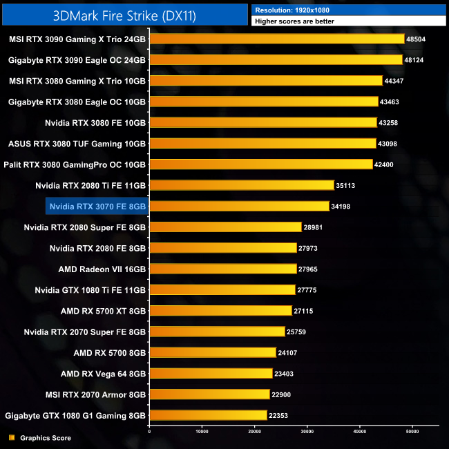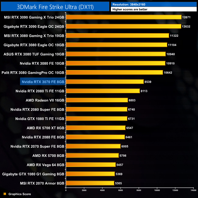 Let's kick things off with a look at 3DMark synthetic benchmarks. Here, the performance uplift for the RTX 3070, compared to the RTX 2070, ranges from 49% in Fire Strike, up to 61% in Fire Strike Ultra. Up against the RTX 2080 Ti, we can see small losses in Fire Strike and Time Spy – by 3% and 4%, respectively – before the 3070 nudges ahead in Fire Strike Ultra.